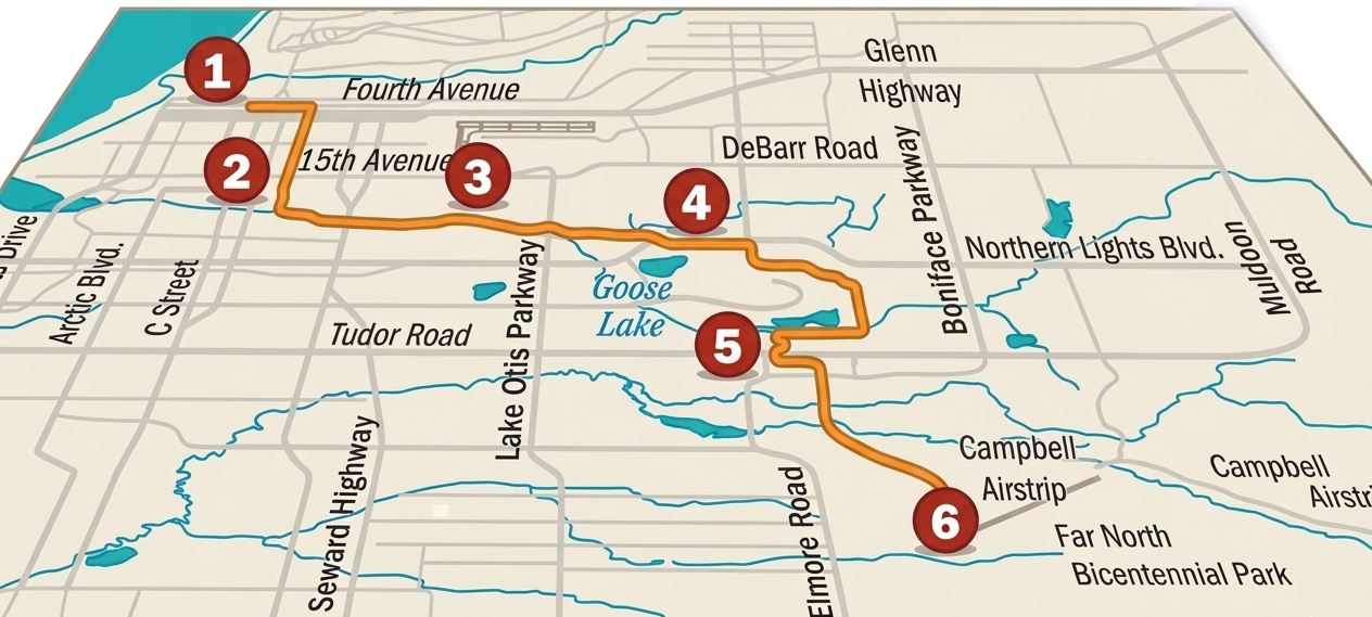 The ceremonial start takes place in downtown Anchorage — typically along 4th Avenue — and feels more like a winter festival than a race, yet it remains an essential part of the Iditarod experience. Beginning at 10 AM, mushers depart from Fourth Avenue and D Street in three-minute intervals, covering an approximately 11-mile route through Anchorage’s trail system before reaching Campbell Airstrip.